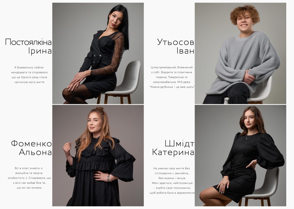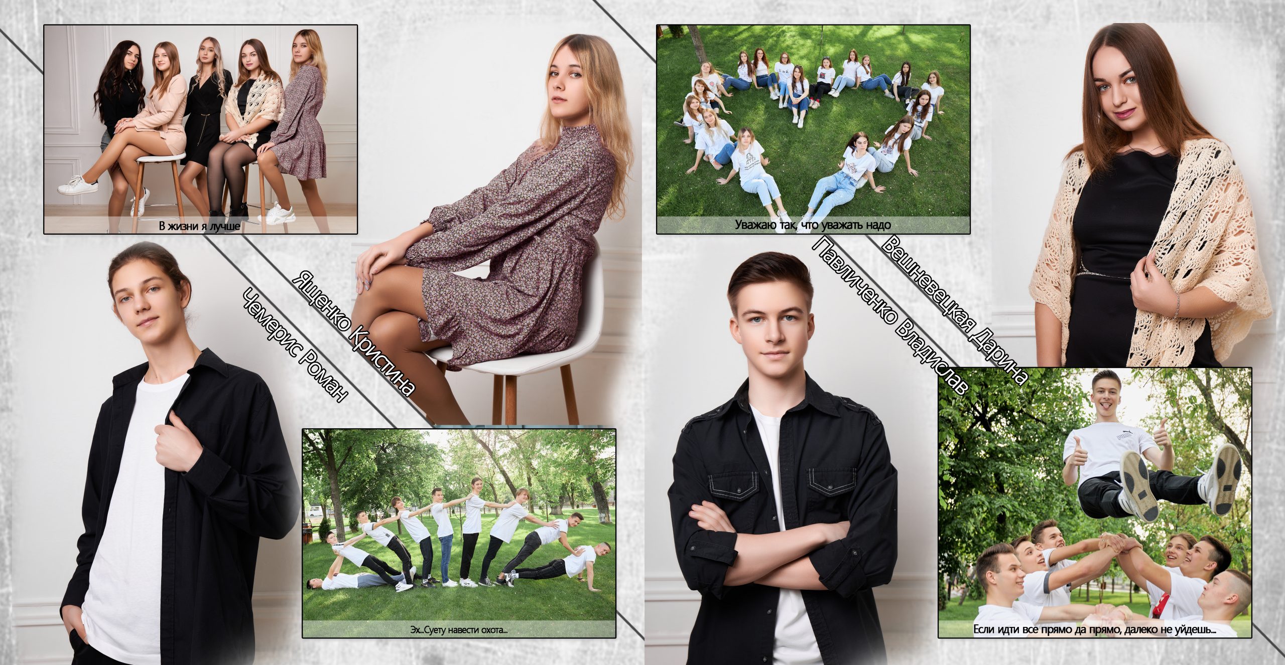 Шаблон обговорюватиметься вже з дітьми, і їм буде запропоновано кілька варіантів. І можливий варіант, що вони самі запропонують якийсь шаблон. Зазвичай він вибирається більшістю. Так само з учнями ми обговорюємо фон на якому будуть портрети, і локації для групових фото.